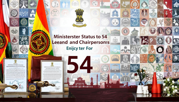 ಕರ್ನಾಟಕ ರಾಜ್ಯ ಸರ್ಕಾರವು ಐತಿಹಾಸಿಕ ನಿರ್ಧಾರ ತೆಗೆದುಕೊಂಡಿದೆ. ರಾಜ್ಯ ವ್ಯಾಪ್ತಿಯ ನಿಗಮ, ಮಂಡಳಿ ಮತ್ತು ಪ್ರಾಧಿಕಾರಗಳ ಅಧ್ಯಕ್ಷರಾಗಿರುವ ಒಟ್ಟು 54 ಮಂದಿಗೆ ರಾಜ್ಯ ಸಚಿವರ ಸ್ಥಾನಮಾನ ನೀಡಲಾಗಿದೆ. ಈ ನಿರ್ಧಾರವು ಪಕ್ಷದ ಮುಖಂಡರಿಗೆ ಮತ್ತು ವಿವಿಧ ಸಂಸ್ಥೆಗಳ ಮುಖ್ಯಸ್ಥರಿಗೆ ಗೌರವ ಮತ್ತು ಅಧಿಕಾರ ನೀಡುವ ಉದ್ದೇಶವನ್ನು ಹೊಂದಿದೆ.