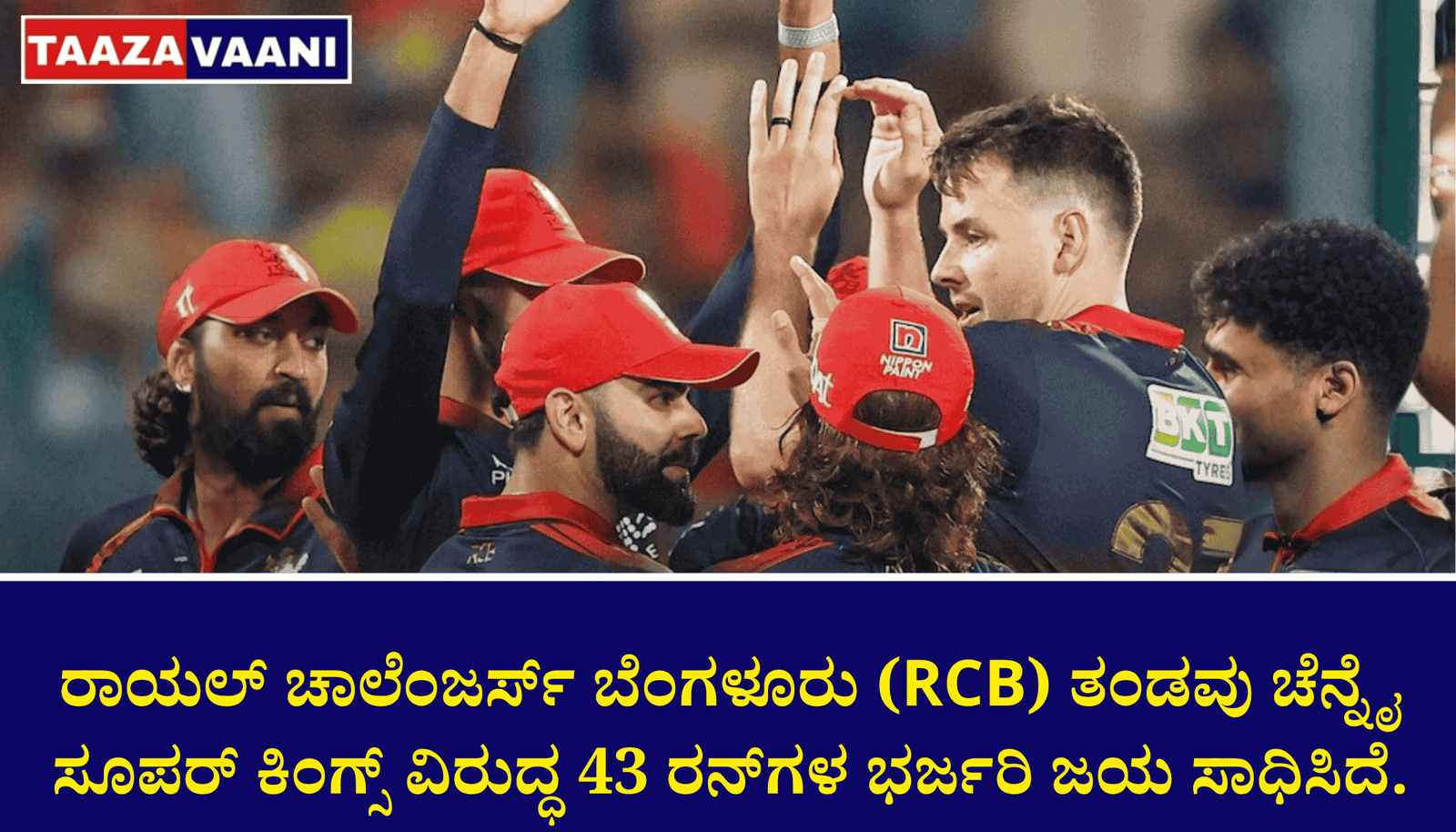 ಬೆಂಗಳೂರಿನ ಎಂ. ಚಿನ್ನಸ್ವಾಮಿ ಕ್ರೀಡಾಂಗಣದಲ್ಲಿ ನಡೆದ ಐಪಿಎಲ್ 2026ರ 11ನೇ ಪಂದ್ಯದಲ್ಲಿ ರಾಯಲ್ ಚಾಲೆಂಜರ್ಸ್ ಬೆಂಗಳೂರು (RCB) ತಂಡವು ಚೆನ್ನೈ ಸೂಪರ್ ಕಿಂಗ್ಸ್ ವಿರುದ್ಧ 43 ರನ್ಗಳ ಭರ್ಜರಿ ಜಯ ಸಾಧಿಸಿದೆ. ಈ ಗೆಲುವಿನೊಂದಿಗೆ ಆರ್ಸಿಬಿ ಅಂಕಪಟ್ಟಿಯಲ್ಲಿ ಅಗ್ರಸ್ಥಾನಕ್ಕೆ ಲಗ್ಗೆ ಇಟ್ಟಿದೆ.